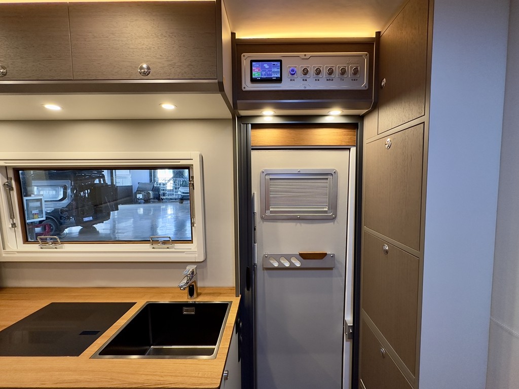 水电设计部分,依然秉承大水、大电、脱离营地的越野旅行概念,并力求做到继续精进一步,因此其拥有房车专用 纯钛水箱170L冷水箱、房车专用 60L 灰水箱房车专用重力带锁加水口,水量充足,满足野外露营生活。整车11度电,210AH 48V 磷酸铁锂电池及 BMS 电池管理系统、荷兰进口VICTRON 一体充逆变系统4500W ,700W 房车太阳能板、220V 房车专用外接电源接入口,电器随心使用再也不怕找不到电力供给了。